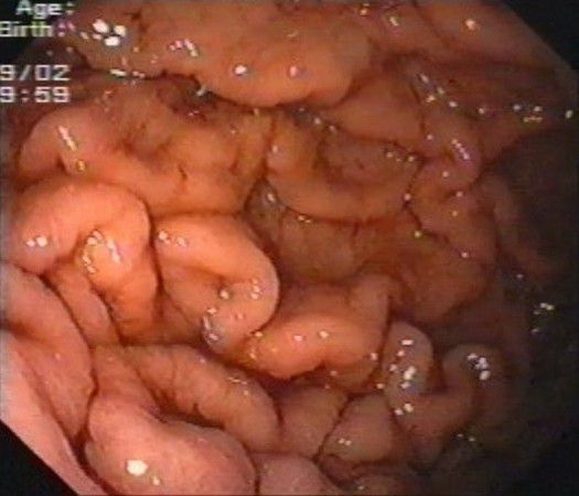 Menetrier disease is a rare disorder characterized by large gastric folds secondary to excessive growth of mucus cells. The cause is idiopathic. The patient with Menetrier disease presents with pain in the epigastrium. Nausea, vomiting, diarrhea, weight loss, and anorexia. It is a protein-losing gastropathy i.e., proteins are lost from circulation into gastrointestinal tract. This loss of proteins can cause edema. Ulcerations and erosions can cause bleeding. Menetrier disease shows slight male preponderance. It usually occurs in fifth decade. Due to vague symptomatology, the prevalence of Menetrier disease is not known. Reference: https://rarediseases.org/rare-diseases/menetrier-disease/ Image via: https://step1.medbullets.com/gastrointestinal/110041/menetrier-disease