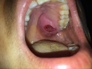 i think it is either syphilitic lesion or a premalignant lesion which will progress to mucoepidermoid carcinoma..