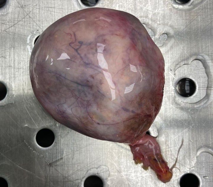Ovarian teratoma or dermoid cyst of the ovary is a benign tumor which usually contains a diversity of tissues including teeth, bone, hair etc Dermoid cyst develops from totipotent germ cells retained within the ovary which can give rise to all types of cells in a mature tissue such as hair, bone, sebaceous material, neural tissue and teeth. By: https://www.instagram.com/p/CFah008BR_t/?utm_medium=copy_link