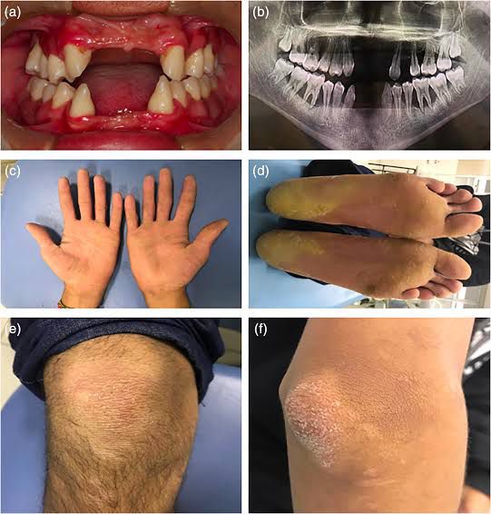 Papillon–Lefèvre syndrome (PLS) is a rare autosomal recessive disorder which occurs due to the mutation in 'cathepsin C gene' critical for appropriate immune response of myeloid and lymphoid cells, and important for normal structural growth and development of of skin. ORAL AND CLINICAL MANIFESTATIONS : Clinically they present as Palmar plantar keratosis,hyperhidrosis, nail dystrophy, and keratosis on the elbows and knees. Dermatologically they present as yellow brown red flakes. Oral manifestations include dramatically advanced periodontitis seen in both deciduous and permanent dentition. At Age 4 to 5 all primary teeth have been lost or extracted. once edentulous the gingiva returns to normal health until the eruption of permanent dentition which then restarts the cycle. By age 15 all the permanent teeth have been lost. TREATMENT : The most successful treatment in this regard is systemic retinoids. Image by: https://images.app.goo.gl/8mygk2Le15VfZHo87