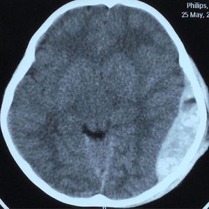 Massive epidural hematoma ( volume : 96,4 cc), a young boy admitting to ER with LOC after RTA. Note the swirl sign indicating there is a on going bleeding