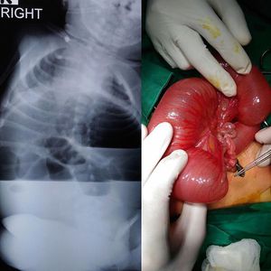 Jejunoileal atresia. Plain abdominal radiograph demonstrating an obstruction. Type I ileal atresia seen at laparotomy. Jejunoileal atresias are nearly equally distributed between the jejunum (51%) and ileum (49%). Most atresia occurs in the distal ileum (36%). Multiple atresia can occur (6% to 20%).