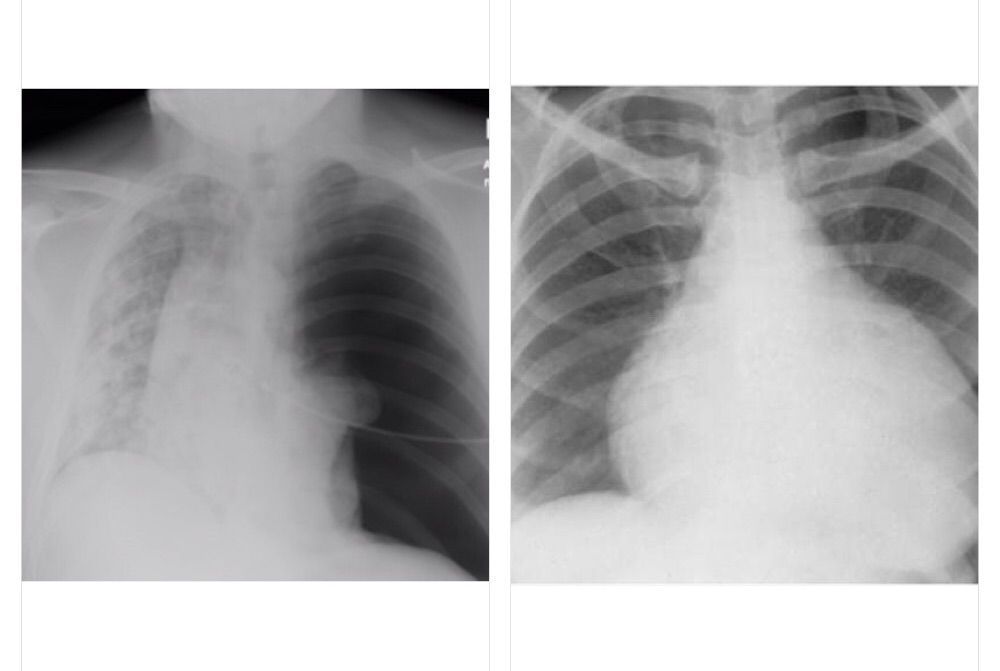 Above left is a X-ray of tension pneumothorax.you can appreciate the air accumulation which is darker area there.it’s mostly of penetrating trauma rather blunt injury. A life threatening event ,caused by accumulation of air the pleural space due to breach in the 🫁 surface(stab injury),medical ,surgical causes.this breach act as a one way -which leads to positive pressure accumulation-shifting mediastinum to other side.Needle decompression f/b tube thoracostomy in the 2nd IC space midclavicular line is the management. Above right side is the X-ray of cardiac tamponade -medical emergency-due to accumulation of blood ,fluid in the pericardial space due to chest trauma, aortic rupture,TB,cancer,pericarditis,MI,etc.. immediate drainage should be done.-pericardiocentesis(subxiphoid -for unstable patients).immediate radio confirmation and Echo is required. clinically both may look similar but we can differentiate. T-pneumothorax:— 1.no breathe sounds (hyper resonance on percussion)2.increased JVP 3.hypotension. Cardiac tamponade:—1.muffled heartsounds 2.increased JVP 3.hypotension{BECKS TRIAD}.