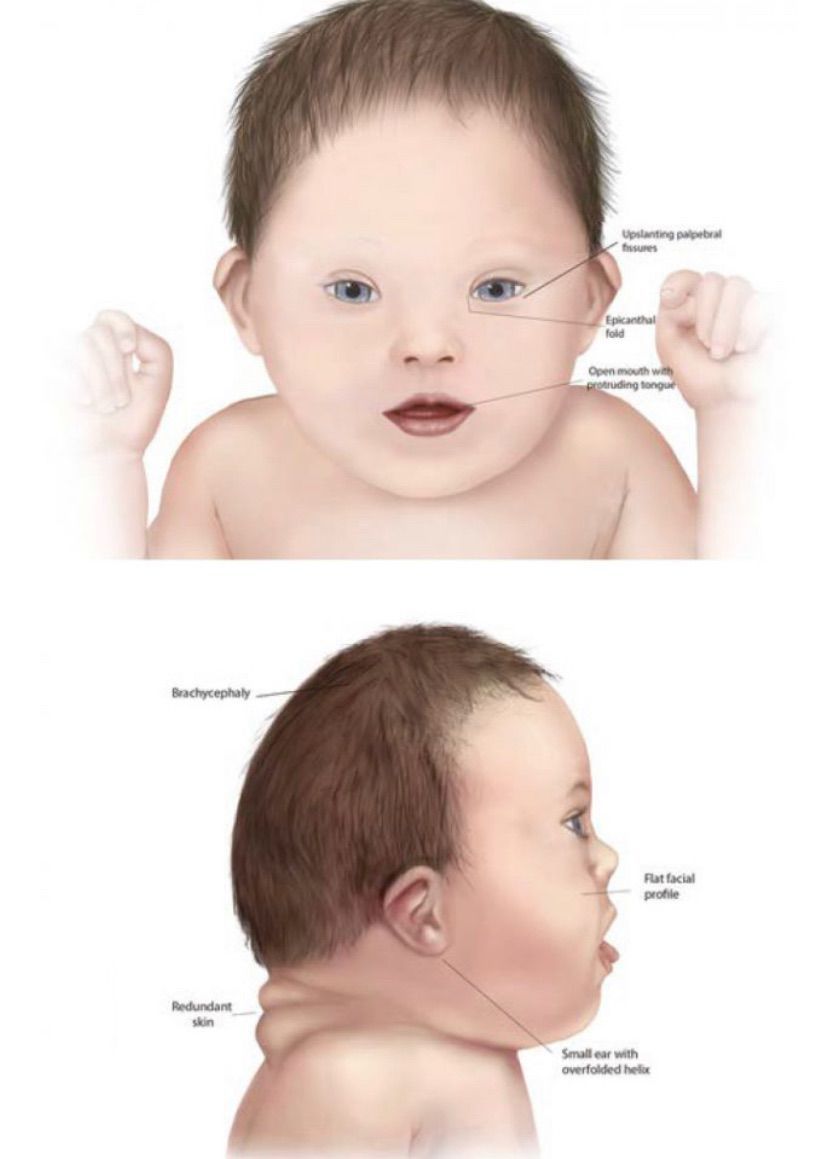 Down syndrome is a congenital disorder characterized by trisomy of chromosome 21 i.e. they have an extra copy of chromosome 21. The patient if the Down syndrome presents with: 1. Flattened face and nose 2. Almond shaped eyes or slanting eyes 3. Webbed neck 4. Small ears and protruding tongue 5. Single crease in hand palm 6. Short strature 7. Weak muscle tone This condition is diagnosed with the help of clinical features and karyotyping. Picture credit: https://www.cdc.gov/ncbddd/birthdefects/downsyndrome.html