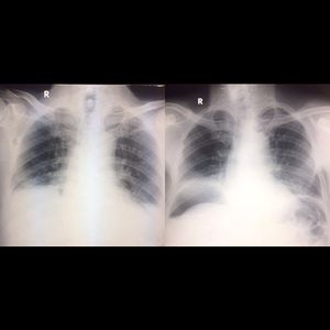 Optimal radiographic technique is important with suspected abdominal perforation. The first photo taken with supine position resulting blunt appereance in both costophrenic recessus which mimicking pleural efusion and there is no free air appereance in sub diaphragma. The second is in same patient buf after 10 minutes in erect position, resulting in large subdiaphragmatic air (outlining the superior surface of the liver). This erect position is very important because at least can detect 2 cc free air which appear as tiny streak air under the diaphragm.