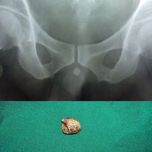 Urinary stone impaction on distal urethra. Diagnosis was made on clinical examination (palpable stone in penile urethra) and with the help of radiology. Surgical procedure was tailored according to the site of impaction. In this case, urethral meatotomy was performed.