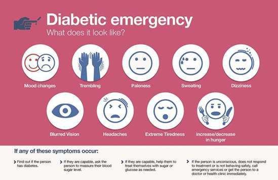 1. Diabetic ketoacidosis (DKA) DKA is commonly associated with type 1 diabetes. It is characterized by the relative or complete absence of insulin, hyperkalemia, hyperglycemia, lipolysis, and proteolysis. 2. Hyperglycemic hyperosmolar state (HHS) HHS is associated with type 2 diabetes. In HHS, the deficiency of insulin is less severe than that in DKA. It is characterized by hyperglycemia, dehydration, and hyperosmolar-induced diuresis. 3. Hyperglycemia without acidosis It can occur in both type 1 and type 2 diabetes. There are no signs of DKA or HHS. It may also be present in chronically hyperglycemic patients. 4. Hypoglycemia The most common cause of hypoglycemia is improper usage of insulin. Symptomatic hypoglycemia can be life-threatening. Reference: https://www.jems.com/patient-care/assessment-treatment-of-five-diabetic-emergencies/ Image via: https://www.gulf-times.com/story/576302/Diabetic-emergencies-Warning-signs-and-what-to-do