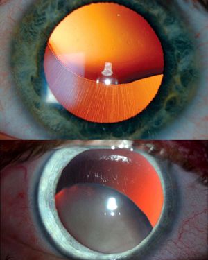 A dislocated lens (ectopic lens) is a lens that has moved out of position as a result of disruption of the ciliary body zonules that hold the lens in place. Some people are born with conditions that can cause weak ligaments and are prone to having a dislocated lens. For example, about half of the patients with Marfan syndrome, in which there is a defect in fibrillin gene and normal connective tissue function is disrupted, develop upward dislocated lenses (the top photo), as well as joint hypermobility, tall stature, scoliosis/kyphosis, long fingers (arachnodactyly) and tendency toward aortic wall aneurysms and ruptures. A downward dislocated lens (bottom photo) is very typical for a condition called Homocystinuria. Homocystinuria is an inherited disorder that affects the metabolism of the amino acid methionine, resulting in the accumulation of homocystine. It is associated with cardiovascular disease, deep vein thrombosis, thromboembolism, and stroke. Intellectual disability and ectopic lens do occur too. The main differentiating feature is lens dislocation that is downward rather than upward. Generally, there is no pain associated because the lens lacks sensory innervation. If a lens dislocation blocks aqueous drainage from the eye, there may be an acute rise in intraocular pressure. If this occurs, the patient may complain of nausea, intense eye pain, headache, vomiting, and blurred vision.
