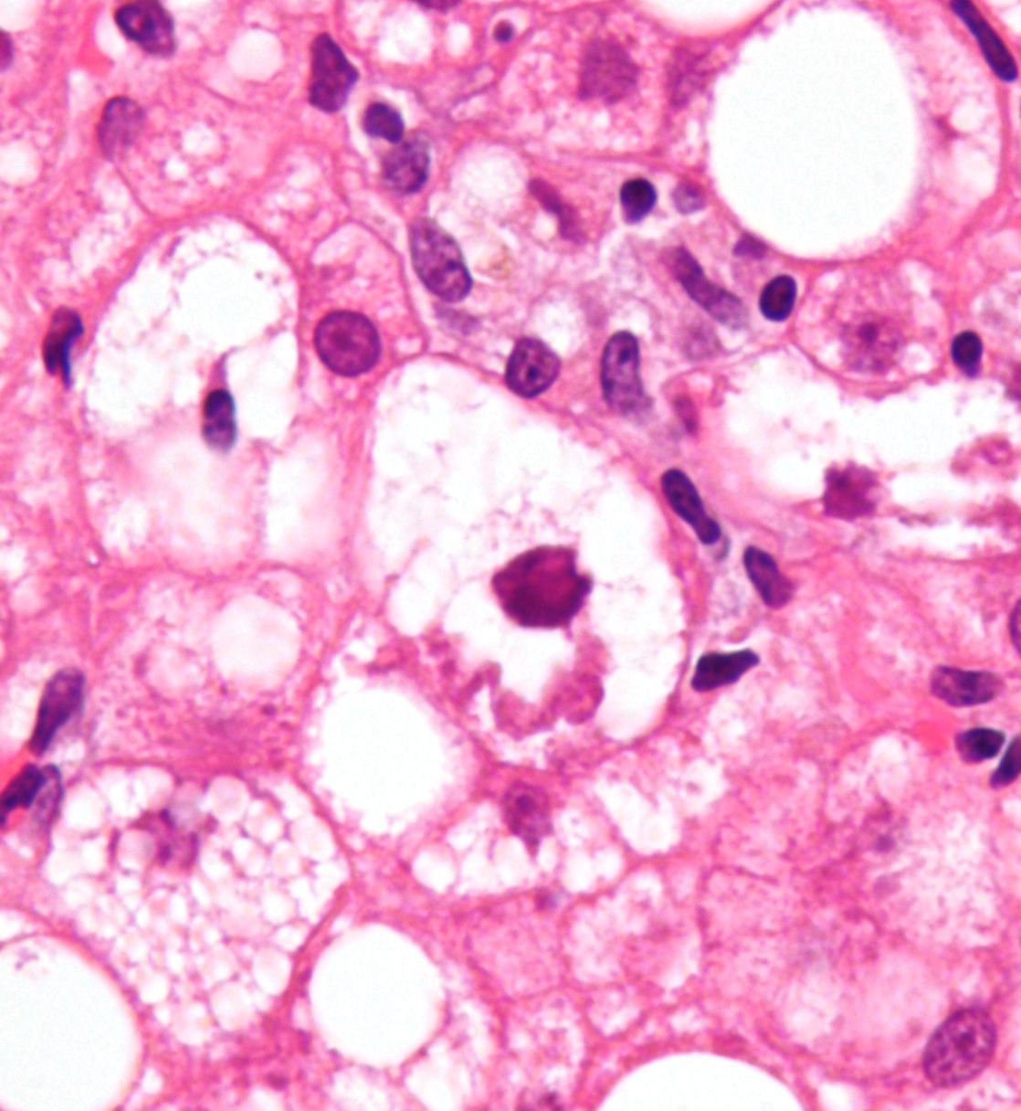Alcoholic fatty liver disease refers to the accumulation of fat globules in the hepatocytes as a result of chronic consumption of alcohol. Binge-drinking can also cause cirrhosis. On biopsy, Mallory bodies are found in hepatocytes. Mallory bodies are cytoplasmic inclusion that are produced as a result of damaged intermediate filaments. These inclusions are eosinophilic. Source: https://en.wikipedia.org/wiki/Mallory_body