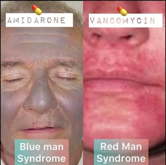 Red man syndrome (RMS) is an anaphylactoid reaction due to the rapid infusion of the glycopeptide antibiotic vancomycin. RMS is characterised by pruritic, erythematous rash of the face, neck, and upper torso, which may also involve the extremities to a lesser degree. Blue man syndrome is a condition that presents with ceruloderma—a bluish, cyanotic-like skin hyperpigmentation caused by long-term administration of the antiarrhythmic medication amiodarone. Credits: https://images.app.goo.gl/fTHKBBrDgk1Bifmn6 https://www.ncbi.nlm.nih.gov/books/NBK482506/#:~:text=Red%20man%20syndrome%20(RMS)%20is,though%20to%20a%20lesser%20degree.