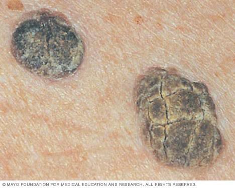 Seborrheic keratosis is a non-cancerous lesion of skin seen mostly in elderly patients. This condition is characterized by the presence of hyper-pigmented lesions of brown, black or light tan color. The lesions are slightly elevated and scaly. They are clinically diagnosed by their “stuck on” appearance. Picture credit: https://www.mayoclinic.org/diseases-conditions/seborrheic-keratosis/symptoms-causes/syc-20353878