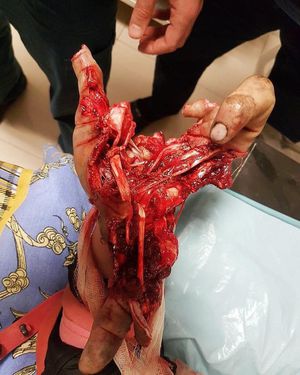 Unbearably painful! This patient was fishing with explosives, unfortunately one of them exploded in his hand before throwing it in the water. Injury caused by a firework exploding while being held can have a devastating effect on the functional status of the hand. They include soft tissue injuries, fractures, burns and traumatic amputations in addition to disruption of the neurovascular supply. Children are the most likely victims of fireworks injuries due to misuse. Injured patients often report that the fuse simply burned too quickly and ignited the device before the device could be released or thrown. The pattern of these injuries are quite different from those of large scale blast injuries because in most cases these blast injuries occur from firecrackers and homemade bombs, which have a variable blast potential with low intensity explosives deflagrating at rates up to 400 m/s and high intensity explosives deflagrating at rates varying from 1000–9000 m/s. Plastic surgeons are frequently involved in the primary care of these patients as many such injuries involve the hand and require amputations and reconstruction surgeries.