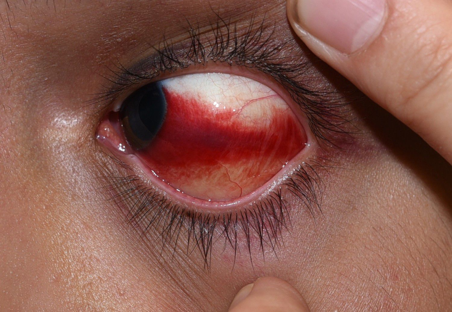 Subconjunctival hemorrhage is a benign condition of the eye that occurs due to the rupture of the conjunctival blood vessels. It is characterised by the appearance of one or more blood spots on the white of the eye. Sometimes the bleeding is extensive so a larger area of the eye appears red. Despite its appearance it is actually a painless condition and sometimes the patient doesn't even know that he/she has the condition until he/she looks in the mirror.