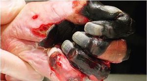 Looks like necrosis after a snake bite. May also be Gangrene.