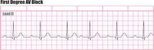 is a disease of the electrical conduction system of the heart in which the PR interval is lengthened beyond 0.20 seconds. In first-degree AV block, the impulse conducting from atria to ventricles through the AV node is delayed and travels slower than normal. It has aprevalence in the normal (young adult) population of 0.65-1.1% and the incidence is 0.13 per 1000 persons. Causes: The most common causes of first-degree heart block are an AV nodal disease, enhanced vagal tone (for example in athletes), myocarditis, acute myocardial infarction (especially acute inferior MI), electrolyte disturbances and medication. The drugs that most commonly cause first-degree heart block are those that increase the refractory time of the AV node, thereby slowing AV conduction. These include calcium channel blockers, beta-blockers, cardiac glycosides, and anything that increases cholinergic activity such as cholinesterase inhibitors. Digitalis is a sodium/potassium ATPase inhibitor and also prolongs AV conduction. * In first-degree heart block, the diseased AV node conducts the electrical activity more slowly. This is seen as a PR interval greater than 200 ms in length on the surface ECG. It is usually an incidental finding on a routine ECG.