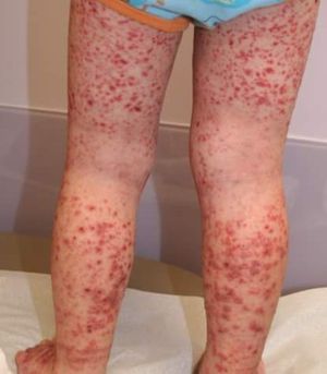A 6years old boy presents with joint pain,hematuria and blood in the stool following an episode of pharyngitis 2weeks ago. Examination reveals palpable red lesions on lower extremities as seen in fig ,This patient's disease is most similar to which of the following disease? 1.Idiopathic thrombocytopenic purpura