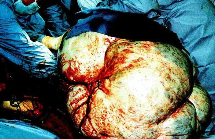The largest tumour ever removed intact was a multicystic mass of the right ovary weighing 138.7 kg (306 lb). The growth had a diameter of 1 m (3 ft) and was removed in its entirety in October 1991 from the abdomen of an unnamed 34-year-old woman.