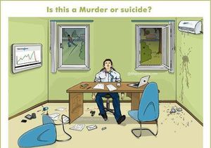 Definetly a murder, if the guy in the background running away and the open window are not enough, there is also a sign of a struggle. More importantly there are no 'comforts' people who commit suicide have comforts around them to encourage them. He was also half way through doing something. Finally, bleeding is on the right side of the face which indicates the gunshot would came from the left, but the gun is on the floor next to the right hand.