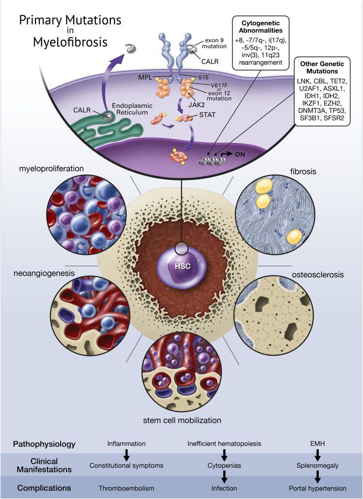 Myelofibrosis is a condition leading to obliteration of bone marrow by fibrous tissue. Often associated with mutations in the JAK-signaling pathway, it leads to marrow failure, peripheral cytopenia and excessive extramedullary hematopoiesis. Learn about the pathogenesis and key features in the image above. Source: https://www.sciencedirect.com/science/article/pii/S0268960X20300412#f0010