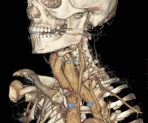 A healthy 23-year-old woman was referred to our cardiology clinic for evaluation of a murmur and an increasingly pulsatile neck mass (Video), first noted 2 years before presentation. Physical examination revealed a prominent pulsation in the right side of the neck and an early diastolic murmur, grade 2/6, in the aortic position. Her blood pressure was 134/78 mm Hg in the right arm and 122/72 mm Hg in the left arm. No radial–radial or radial–femoral delay was appreciated. Transthoracic echocardiography revealed a bicuspid aortic valve with mild aortic regurgitation. Computed tomographic angiography (reconstructed image) revealed a cervical aortic arch with the left common carotid artery arising from the ascending portion (arrow 1) and the left subclavian artery arising from the descending aorta (arrow 2). Embryologically, this anomaly has been considered to result either from regression of the fourth aortic arch (with persistence of the third) or from the failure of normal caudal descent of the aortic arch system. The patient underwent reconstruction of the cervical arch, with adjustment to an intrathoracic position. She was doing well at follow-up 18 months after surgery. Tarun W. Dasari, M.D., M.P.H. Marco Paliotta, M.D. University of Oklahoma Health Sciences Center, Oklahoma City, source: nejm.org