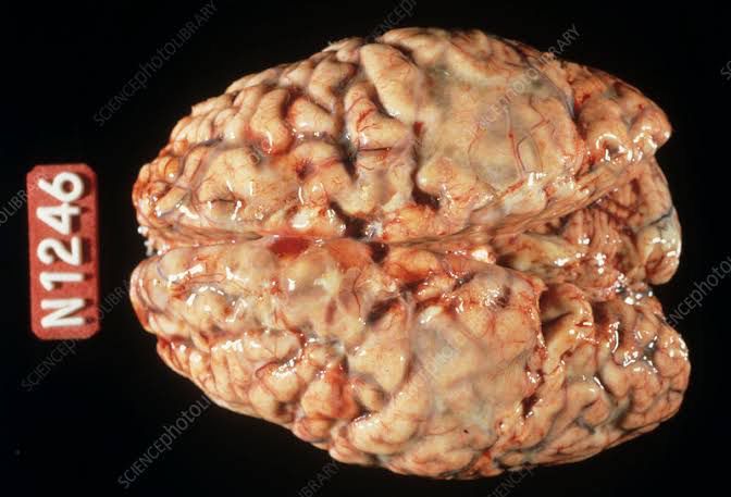 Meningitis is defined as the inflammation of the meninges of brain. It occurs due to various reasons like infections (bacterial, fungal, viral), cancer, chemical irritants. People with meningitis presents with symptoms like severe headache, high grade fever, neck stiffness, nausea, vomiting, confusion and other neurological symptoms. Picture demonstrates bacterial meningitis with collection of pus beneath the meninges. Picture credit: https://www.sciencephoto.com/media/259670/view/brain-with-meningitis