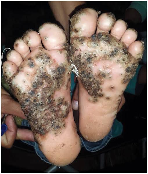 Tungiasis is a skin infestation with the burrowing flea Tunga penetrans or related species. The flea has many common names including, chigoe flea, jigger, nigua, pico, sand flea, and bicho de pie (bug of the foot). The lesions caused by the flea are characterised by a white patch with a black dot in the centre.