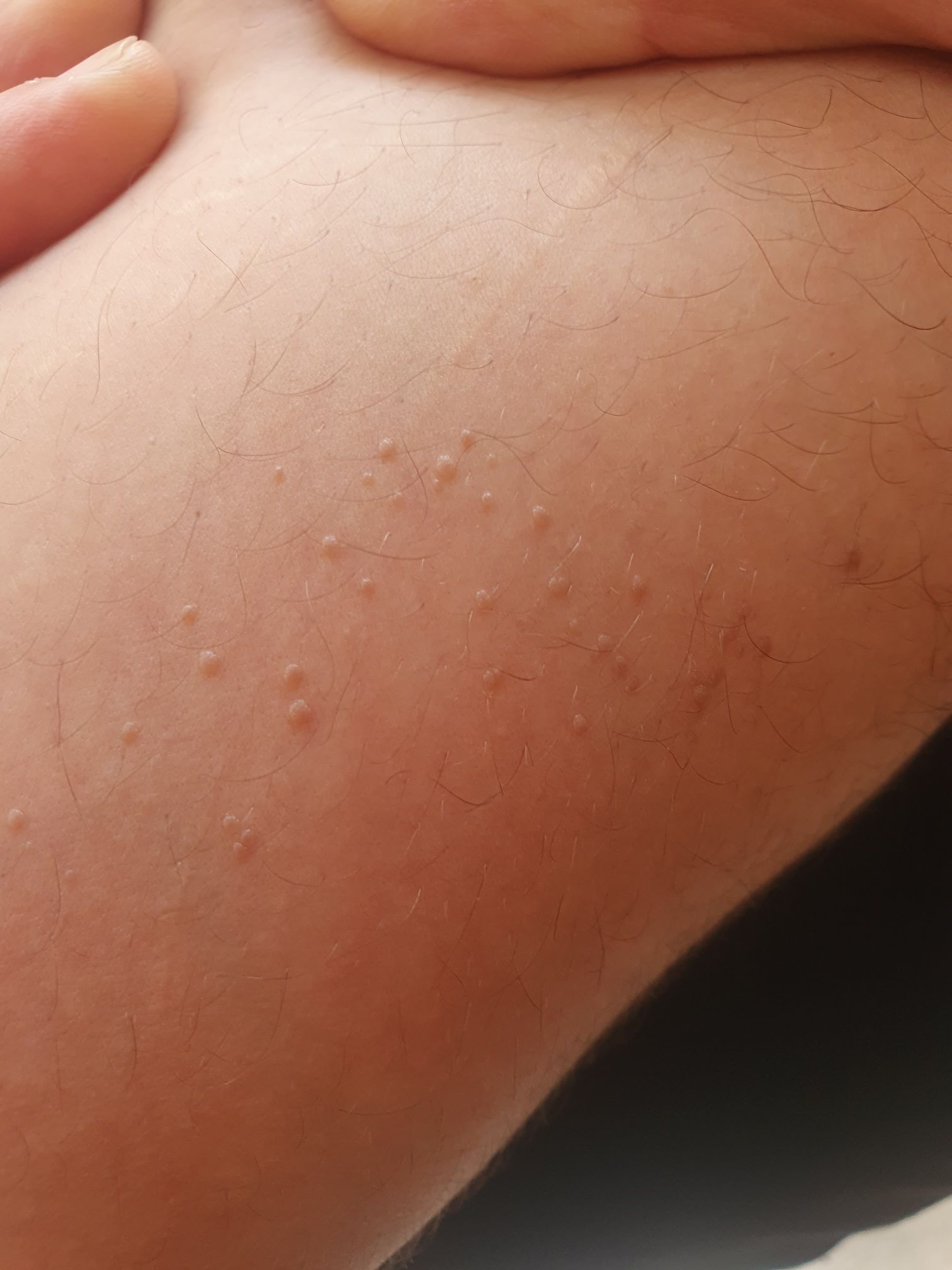 1st, where are these located? The lateral or distal portion of the leg? 2nd, are there more locations with these bumps? If the lateral thigh portion is the only places where these occur, I’d suggest general warts. If these are all over the body, then I’d suggest mollescum contagiosum. Which if you didn’t know, is a family member of the pox virus.