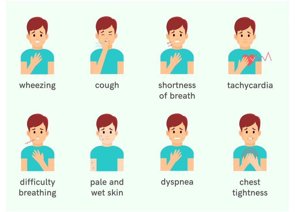 Asthma is a chronic respiratory condition that affects the airways in the lungs. The symptoms of asthma can vary in severity and frequency from person to person, and may include: Wheezing: a high-pitched whistling sound that is made when breathing out. Shortness of breath: feeling like you can't catch your breath or take a deep breath. Chest tightness: a feeling of tightness or pressure in the chest. Coughing: especially at night or early in the morning. Rapid breathing: breathing faster than usual. Difficulty breathing: feeling like you can't breathe deeply enough. Fatigue: feeling tired or exhausted due to difficulty breathing. Trouble sleeping: difficulty falling asleep or staying asleep due to coughing, wheezing, or shortness of breath. Asthma symptoms may be triggered by a variety of factors, including allergens (such as pollen, dust mites, or animal dander), irritants (such as smoke, pollution, or strong odors), exercise, cold air, and respiratory infections. It's important to work with a healthcare provider to develop an asthma action plan to help manage symptoms and prevent asthma attacks.