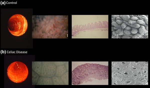 Gluten-sensitive enteropathy is an immune response to protein present in grains. The reaction takes place in small intestine, resulting in malabsorption disease. The gastrointestinal signs and symptoms of celiac disease are: - Constipation - Diarrhea - Bloating - Fatigue - Weight loss - Abdominal pain - Nausea - Vomiting Other signs and symptoms may include: - Anemia - Osteoporosis - Osteomalacia - Dermatitis herpetiformis - Headache - Fatigue - Numbness - Joint pain - Hyposplenism Reference: https://www.mayoclinic.org/diseases-conditions/celiac-disease/symptoms-causes/syc-20352220 Image via: https://link.springer.com/article/10.1007/s11739-013-1044-5