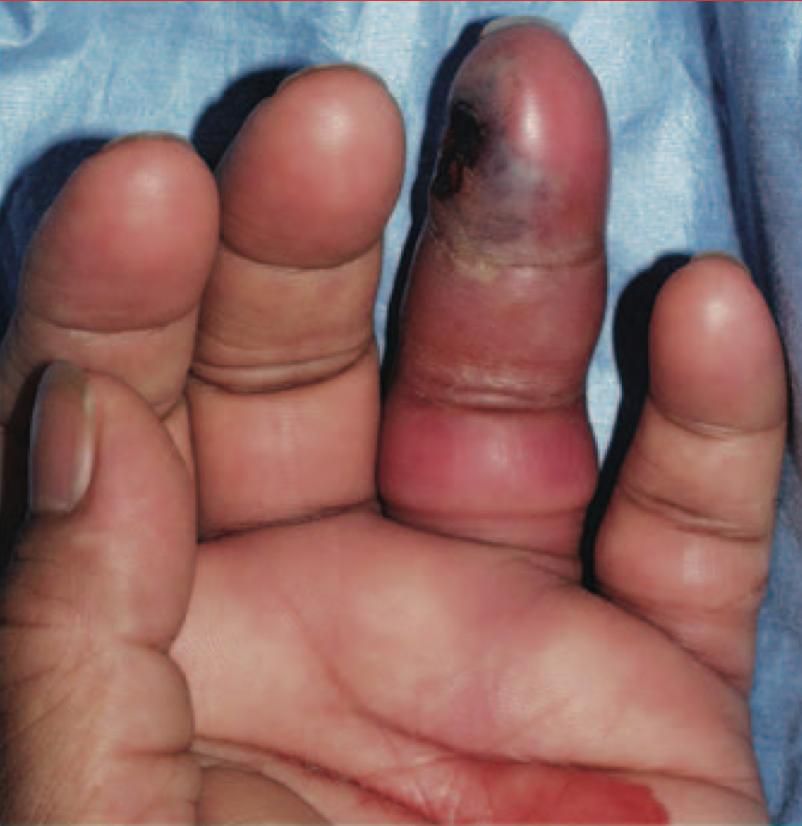Suppurative flexor tendon tenosynovitis is most commonly caused by Staphylococcus aureus and Streptococcus. Clinical features include rapid swelling leading to a painful red swollen finger and the pain exacerbates on extending the finger. If left untreated, adhesions between the tendon and its sheath lead to stiff, useless finger. Treatment options include incision & drainage, hand elevation, splintage and antibiotics.