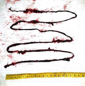 This is a trans femoral embolectomy specimen done for acute lower limb ischemia using a Fogarty embolectomy catheter