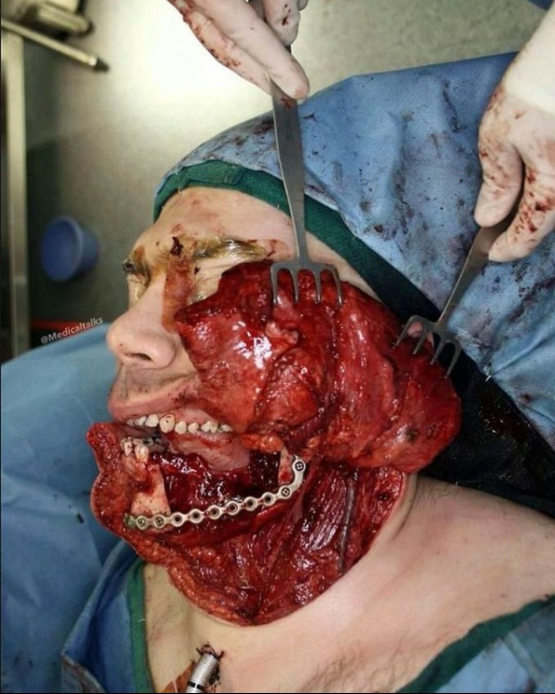 🎈Jaw cancer reconstruction with an outstanding result!! Post-op photos will follow if the demand is shown. 🌟This is a unique case of a resected squamous cell carcinoma that has invaded invaded through the mandible and skin. 💥The picture shows a missing potion of the mandible following a segmental mandibulectomy and reconstruction using a stainless steel titanium plate with 4 screws on either side of the mandibulectomy! 🎈Mandibulectomy is a procedure that is used to eradicate disease that involves the lower jaw or mandible. This procedure is used in various settings, including infectious etiologies (eg, osteomyelitis), osteoradionecrosis, or a benign (eg, ameloblastoma) or malignant neoplastic process (eg, invasive squamous cell carcinoma) that involves the jaw. 🌟Segmental mandibulectomy is indicated for the resection of tumors with gross bone invasion. The cancellous bone of the mandible offers no barrier to the progression of squamous cancer through the bone.