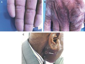 A 67-year-old man presented with a 2-month history of widespread thickening of his skin and a 2-week history of multiple cutaneous nodules in the right infraauricular region. He had a history of squamous-cell carcinoma of the tongue base. Examination of the palmar side of his hands revealed velvety, thickened ridges resembling tripe (Panel A). Hyperpigmentation and accentuation of skin markings were noted at multiple locations, including the joints of his hands (Panel B), suggesting acanthosis nigricans. A 4-cm subcutaneous nodule (Panel C, short arrow) and approximately 10 skin-colored papules (Panel C, long arrow) were noted in the right preauricular and infraauricular regions, respectively. Biopsy of the palmar skin revealed acanthosis palmaris, and biopsy of the skin-colored papules revealed cutaneous metastases of squamous-cell carcinoma. Acanthosis palmaris (also known as tripe palms or acquired pachydermatoglyphia) is typically manifested as velvety, diffuse palmar hyperkeratosis and accentuated dermatoglyphic patterns and is usually associated with cancer, most often gastric or lung cancer. Because the patient was under an oncologist's care and declined topical treatment, we did not start additional therapy. Sule Güngör, M.D. Ilteris Topal, M.D. Okmeydani Training and Research Hospital, Istanbul, Turkey Source: nejm.org
