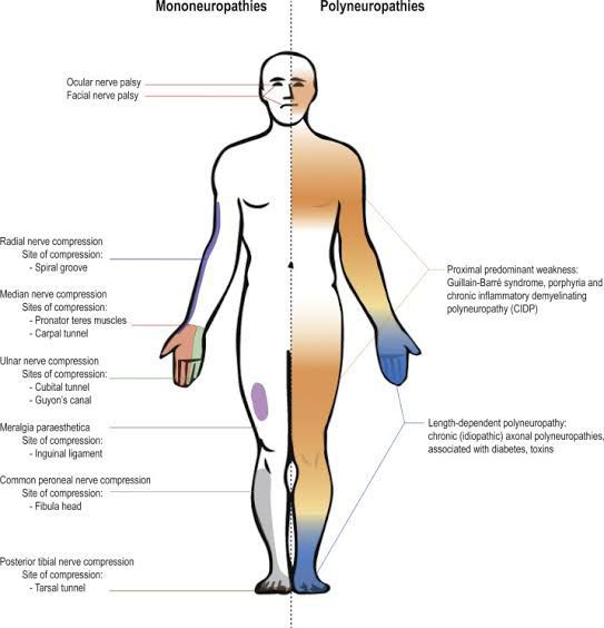 Peripheral nerves may be involved in a huge variety of diseases which may range from local compression to widespread disturbances such as diabetes and autoimmune diseases. The image shows some common types and patterns of peripheral neuropathies and the sites of involvement of some commonly compressed nerves. https://www.sciencedirect.com/topics/nursing-and-health-professions/peripheral-neuropathy