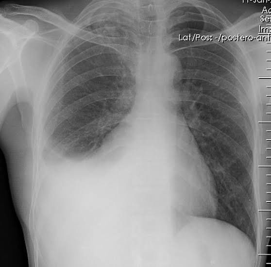 Pleural effusion is defined as the collection of fluid in the pleural space. Fluid can be of two types: TRANSUDATE: Usually clear Protein concentration <30 g/dL Lactate dehydrogenase < 200 U/L LDH fluid : serum ratio < 0.6 Specific gravity < 1.015 It is usually bilateral. Common causes includes: heart failure, hypoproteinemia, constrictive pericarditis, etc. EXUDATE: Usually cloudy or purulent Protein concentration > 30 g/dL Lactate dehydrogenase > 200 U/L LDH fluid : serum ratio > 0.6 Specific gravity > 1.015 It is usually unilateral. Common causes includes: bacterial pneumonia, tuberculosis, connective tissue disorders, etc. Chest X-ray of pleural effusion reveals opacification of the involved area with blunting or obliteration of costophrenic angle on the effected side. In cases of massive effusion, mediastinum is shifted to the contralateral side. Picture credit: https://radiopaedia.org/cases/pleural-effusion-7