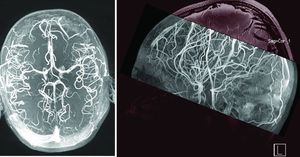 Figure shows a TOF image obtained at 7T depicting the multiple arterial branches arising from the anterior and middle cerebral trunks.