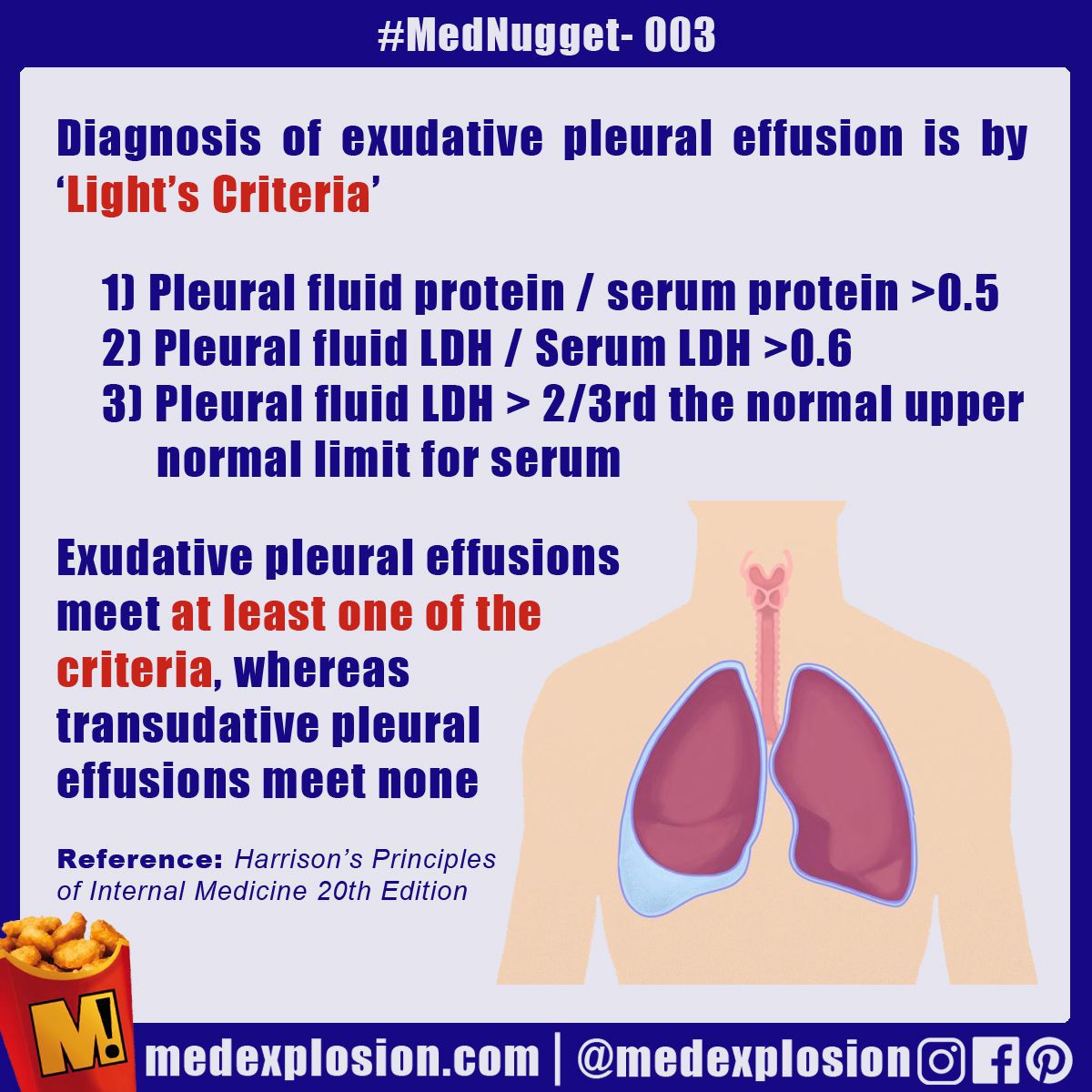 Light's criteria help differentiate whether pleural fluid is of exudative or transudative nature. The former is rich in proteins and cells and usually occurs in infective or malignant etiologies while the latter occurs in congestive heart failure or hypoalbuminemic states. https://www.grepmed.com/images/8814/exudate-pleuraleffusion-mednugget-im-respiratory