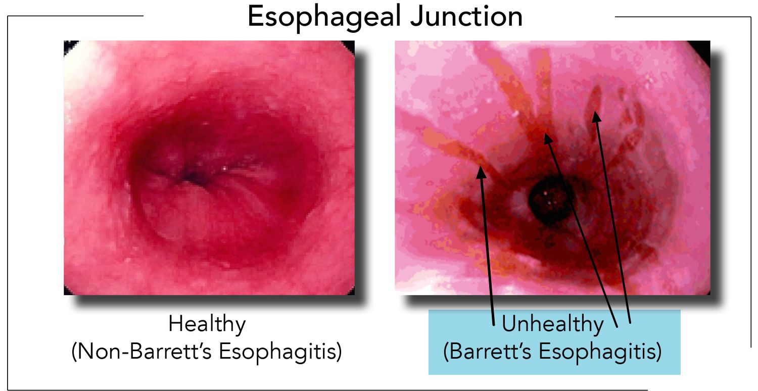 Barrett's esophagus, a precursor to esophageal adenocarcinoma, is a condition in which the normal squamous lining of the esophagus is damaged by gastric acid and replaced by metaplastic columnar cells. These cells change the color of the esophagus from pale-pink to a deep pink/ red. Prevention of acid reflux is the key to prevent its development. This includes avoidance of risk factors such as obesity, stress, smoking, and use of agents which suppress gastric acid in the susceptible population.
