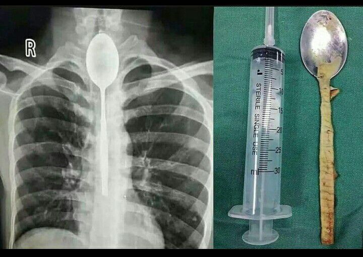 The man, aged in his early 20s and identified only as Mr Zhang, swallowed the spoon in 2017. The steel spoon became lodged in his oesophagus but, as he suffered no pain or discomfort, Mr Zhang did not seek medical attention to remove the utensil. It wasn't until he was recently punched in the chest that the spoon became a problem for Mr Zhang. He presented to hospital with breathing difficulties and chest pain, with x-rays of his torso shocking doctors. Dr Xiwu ruled the spoon a threat to Mr Zhang's life and doctors removed it under general anaesthetic. It took two hours to retrieve the spoon via Mr Zhang's mouth, with the procedure carrying a risk of perforating his oesophagus. Doctors said the spoon was covered in mucus and could have caused a serious infection.However, Mr Zhang recovered well from the procedure and was discharged two days later.