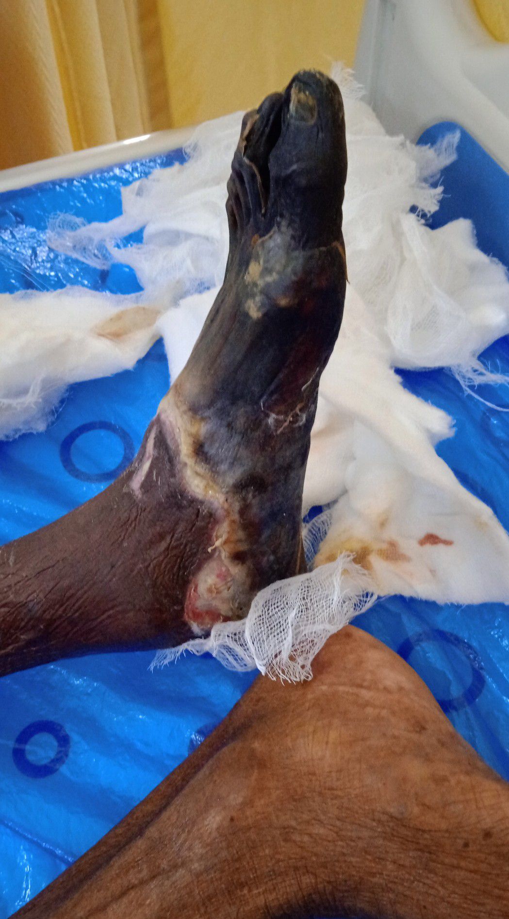 Pt was later posted for amputation followed by antibiotics and insulin ,as diabetes is one of major Predisposing factors