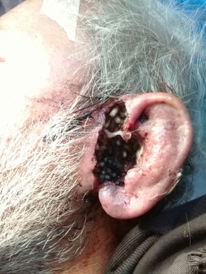 Untreated basal cell skin cancer that was exposed to flies and then became infested with maggots.