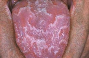 Geographic tongue (benign migrating glossitis), not leukoplakia where the plaques are brighter, the edges are better defined and the plaques raise slightly above the mucosa in oral leukoplakia. Geographic tongue is often associated with a centralized tongue fissure for which vitamin B2 is often administered. However, it is not clear that vitamin B2 will contribute in case of geographic tongue.