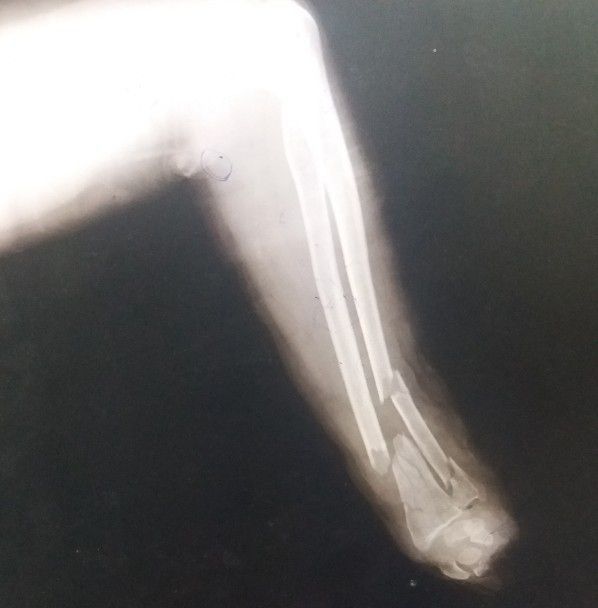 A woman of about 48 yrs old was received in ER with the c/o toka injury on the arm about 30 minites ago.. On gross examination no fingers or hand was found . muscles of the firearm were completely transected (multiple times) n underlying bone could b seen. Nerves and vessel were damaged . Wound was dirty and remains of fodder could be seen. Xray showed both radius and ulnar fracture, radius was completely fractured and ulna was fractured at two points (shaft and distal end). Patient was immediately given fluids, antibiotics, transamine and painkillers via iv line; was stabilized blood arranged and moved to ESOT for amputation(L.A.E.A) After the surgery pt was observed for one day and was discharged the next day to follow up after a week.