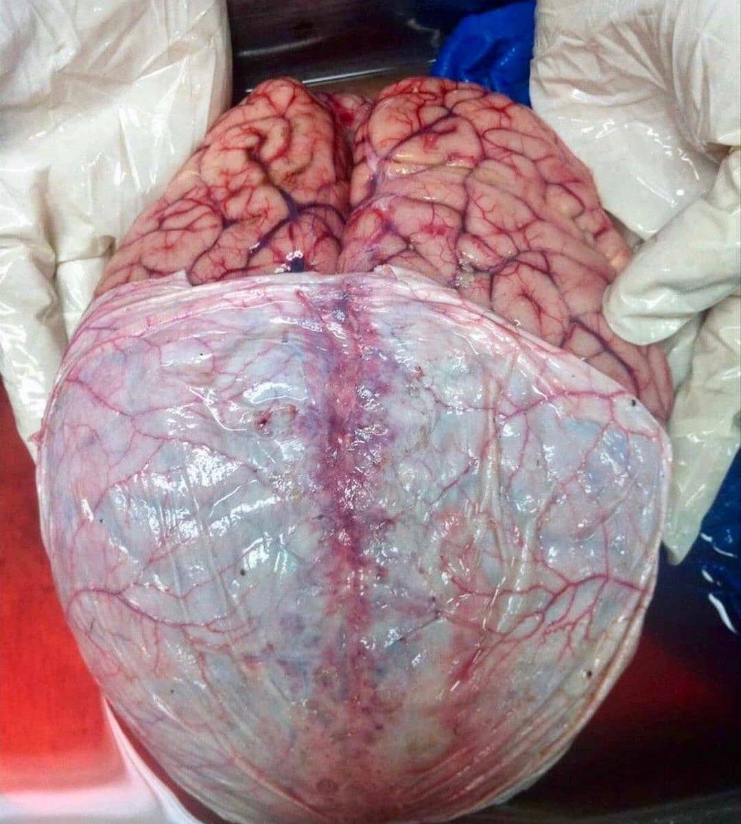 Here is a great shot showing the brain with its covering layer! 🧠Can you name the white sheet displayed here? Below the skull and around the spinel cord are three special coverings called the meninges. You may have heard of the illness called meningitis. Meningitis is an infection of the meninges. The outer layer of the meninges is called the dura mater or just the dura. The dura is tough and thick andit can restrict the movement of the brain within the skull. This protects the brain from movements that may stretch and break brain blood vessels. The middle layer of the meninges is called the arachnoid. Underneath the arachnoid is a space known as the sub-arachnoid space. It contains cerebrospinal fluid, which acts to cushion the brain. Small projections of arachnoid mater into the dura (known as arachnoid granulations) allow CSF to re-enter the circulation via the dural venous sinuses. The inner layer, the pia mater, is located underneath the sub-arachnoid space. It is very thin, and tightly adhered to the surface of the brain and spinal cord. It is the only covering to follow the contours of the brain (the gyri and fissures). Like the dura mater, it is highly vascularised, with blood vessels perforating through the membrane to supply the underlying neural tissue.