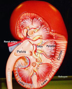 The kidneys are the waste filtering and disposal system of the body. As much as 1/3 of all blood leaving the heart passes into the kidneys to be filtered before flowing to the rest of the body's tissues. While a person could live with only one functioning kidney, our kidneys are vital organs; the loss of both kidneys would lead to a rapid accumulation of wastes and death within a few days time. A thin layer of fibrous connective tissue forms the renal capsule surrounding each kidney. The renal capsule provides a stiff outer shell to maintain the shape of the soft inner tissues. Deep to the renal capsule is the soft, dense, vascular renal cortex. Seven cone-shaped renal pyramids form the renal medulla deep to the renal cortex. The renal pyramids are aligned with their bases facing outward toward the renal cortex and their apexes point inward toward the center of the kidney. Each apex connects to a minor calyx, a small hollow tube that collects urine. The minor calyces merge to form 3 larger major calyces, which further merge to form the hollow renal pelvis at the center of the kidney. The renal pelvis exits the kidney at the renal hilus, where urine drains into the ureter. 📷•Medicogram•
