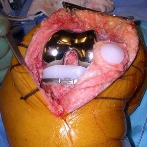 A shiny new metal knee! This image shows an intraoperative view of a total knee arthroplasty or replacement. Notice the femoral and tibial components and the plastic spacer!! Knee replacement, or knee arthroplasty, is a common operation done to relieve the pain and disability from degenerative arthritis, most commonly osteoarthritis, but other arthritides as well. The surgery consists of replacing the diseased and painful joint surfaces of the knee with metal and plastic components shaped to allow continued motion of the knee. This, in fact, is considered a major surgery and involves exposure of the front of the knee, with detachment of part of the quadriceps muscle (specifically the vastus medialis) from the kneecap. The kneecap is displaced to one side of the joint allowing exposure of the distal end of the thighbone (femur) and the proximal end of the shinbone (tibia). The ends of these bones are then accurately cut to shape using cutting guides oriented to the long axis of the bones. The cartilages and the anterior cruciate ligament are removed, but the collateral ligaments are preserved. Metal components are then impacted onto the bone or fixed using poly methyl methacrylate cement. A round ended implant is used for the femur, mimicking the natural shape of the bone. A flattened or slightly dished high density polyethylene surface is then inserted onto the tibial component so that the weight is transferred metal to plastic not metal to metal. During the operation any deformities must be corrected, and the ligaments balanced so that the knee has a good range of movement and is stable. In some cases the joint surface of the kneecap is also removed and replaced by a polyethylene button cemented to the kneecap.
