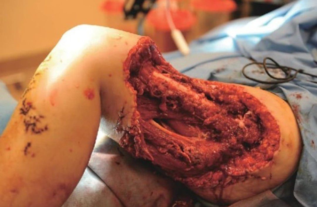 This is a case of a 39-year-old female attacked by a shark while on vacation in Mexico. The patient sustained severe injuries to her left arm and her left thigh. She was transferred to a Canadian institution after ambiguous operative management in Mexico and presented with no clear antibiotic coverage and a Volkman's contracture of the left upper extremity. In total, the patient underwent four washouts of wounds, two split-thickness skin grafts, one free anterolateral thigh flap, and one free transverse rectus abdominus myocutaneous flap for the reconstruction and salvage of the left lower extremity. As with all trauma, hospital-based management of shark attacks initially involves a trauma assesment based on the ATLS guidelines. Once the patient is stable, operative management for further wound exploration is required to better assess all anatomica structures. Copious irrigation and debridement of devitalized tissue is also necessary. The first surgical procedure should be short and goal-oriented. Plain radiographs of all injured sites are necessary to better detect possible fracture, fragments of teeth, or preiosteal injury. Credit: Mélissa Roy, Mathew A Plant, Laura Snell, Archives of plastic surgery 2017