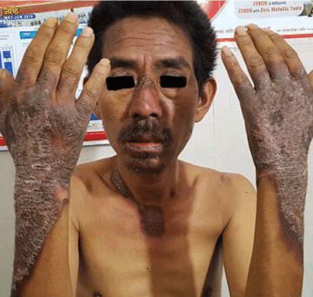 Pellagra is a systemic disease that occurs due to vitamin B3 deficiency. Primary pellagra is due to inadequate intake of vitamin B3 whereas secondary pellagra is be due to other causes despite adequate intake such as malabsorption or it can be drug induced. The disease is characterised by the 4D's - dermatitis, diarrhoea, dementia and death. The skin changes usually occur first and include photosensitivity of the exposed skin sites that initially resembles sunburn and eventually becomes thickened, hyperpigmented and dry. Sometimes a hyperpigmented band/collar becomes visible around the neck and is known as the Casal's necklace. The pellagra glove and boot is another sign in which there are hyperpigmented plaques and fissuring of the hands and feet. There are anogenital and mucosal lesions too (glossitis, cheilitis, inflammed vaginal mucosa). Other symptoms include loss of appetite, vomiting, abdominal pain and diarrhea. Not all the signs and symptoms appear in every individual. The neuropsychiatric symptoms usually occur late in the disease and include apathy, headache, anxiety and even dementia. The treatment consists of general measures and specific measures. For secondary pellagra, treating the underlying cause helps to treat the disease. Topical emollients have proven to be beneficial for the skin changes. Moreover, 300 mg nicotinamide in an oral divided daily dose for 3–4 weeks is recommended to treat pellagra.
