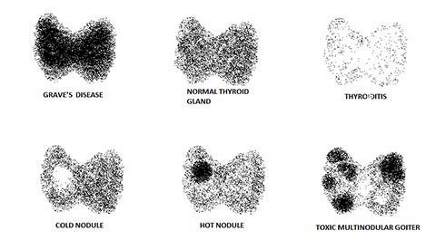Various thyroid pathologies can be assessed by the radioactive iodine uptake test. It is based on the principle that metabolically active thyroid parenchyma will have an increased tracer uptake, and therefore, will present as a darker area compared to normal. Similarly, an area of no tracer uptake shows up as a cold nodule on imaging. Diffuse uptake increase is seen in Graves disease while localized nodular uptake is seen if a focus of thyroid gland is hyperfunctioning. Thyroiditis is accompanied by a decrease in thyroid activity and thus, thyroid uptake. Cold nodules may be cysts, non functioning adenomas or malignant nodules. Image via https://drsaiyan.com/causes-of-hypothyroidism-risk-factor-for-hypothyroid/