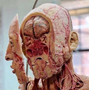 In this plastination you can have a spectacular glimpse on sinuses inside our skull. Sinuses are moist air spaces within the bones of the face around the nose. When they become infected and swell or become irritated, this is called sinusitis (or a sinus infection). These infections usually follow colds or bouts with allergies. Sinusitis is common and easily treated. When someone has a cold or allergies and the nasal passages become swollen and make more mucus, so do the sinus tissues. The drainage system for the sinuses can get blocked, and mucus can become trapped in the sinuses. Bacteria, viruses, and fungi can grow there and lead to sinusitis. 📷•Medicogram•